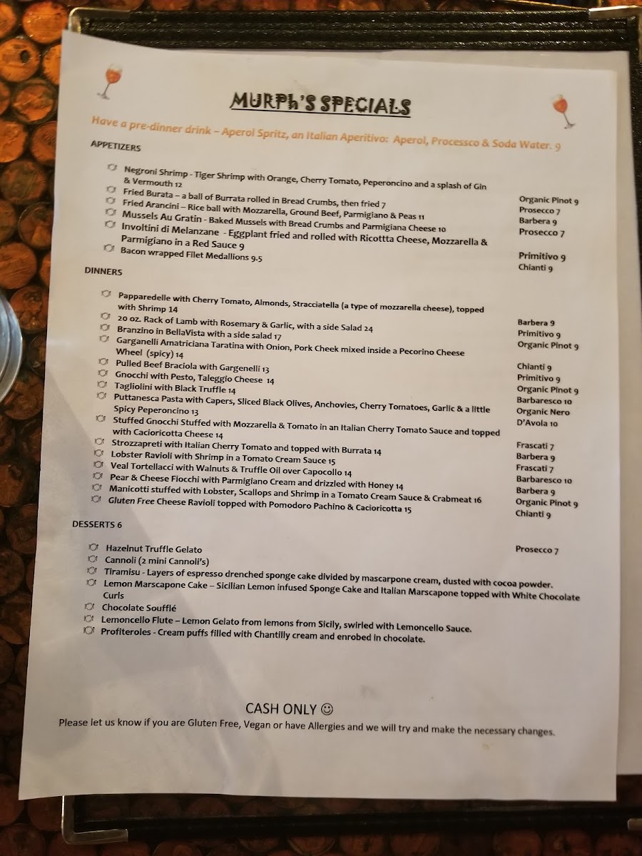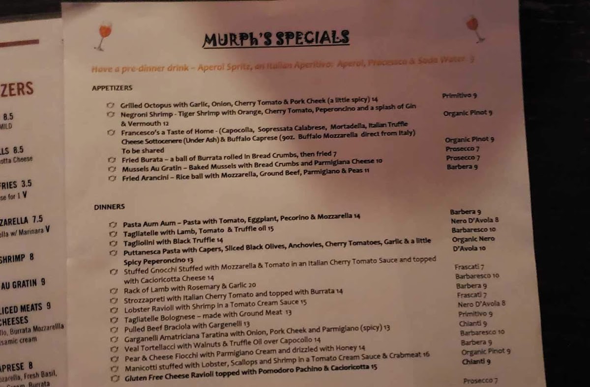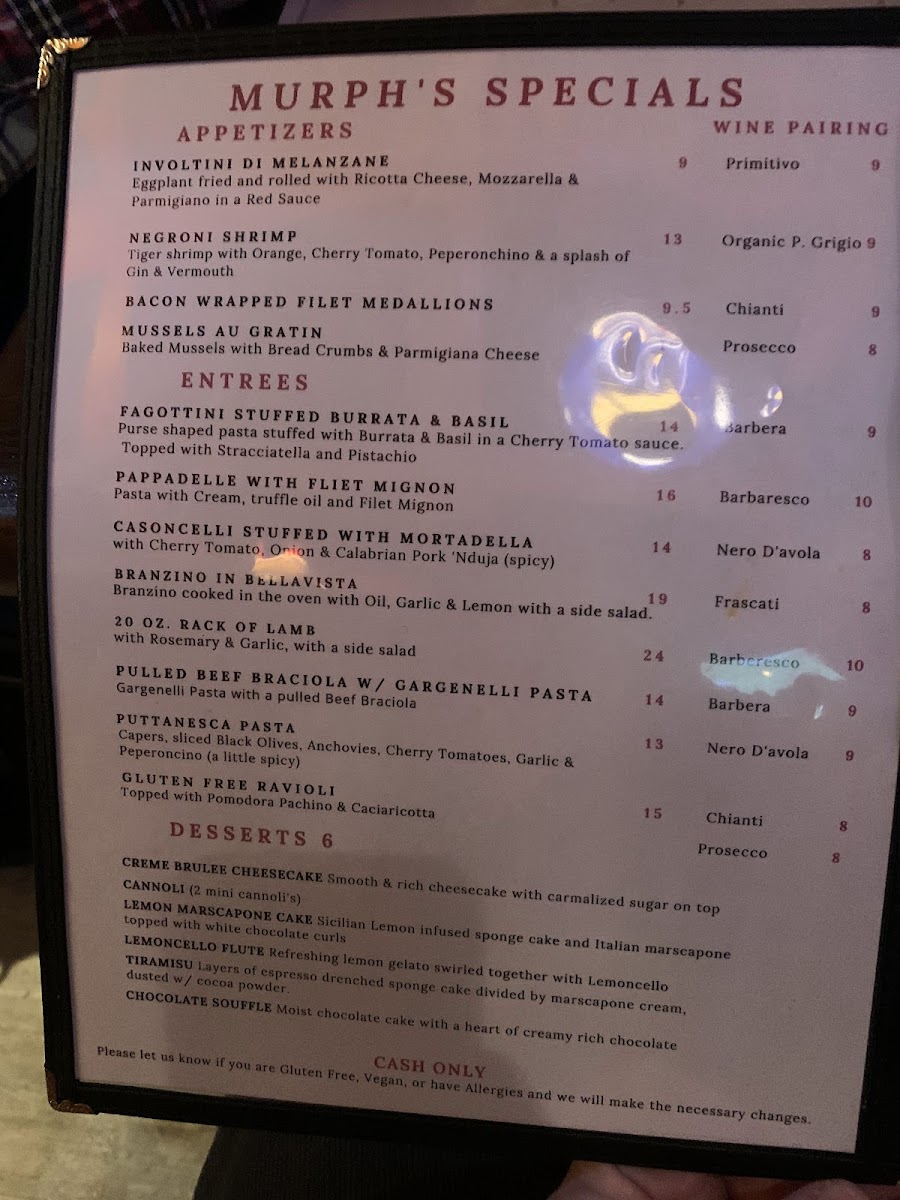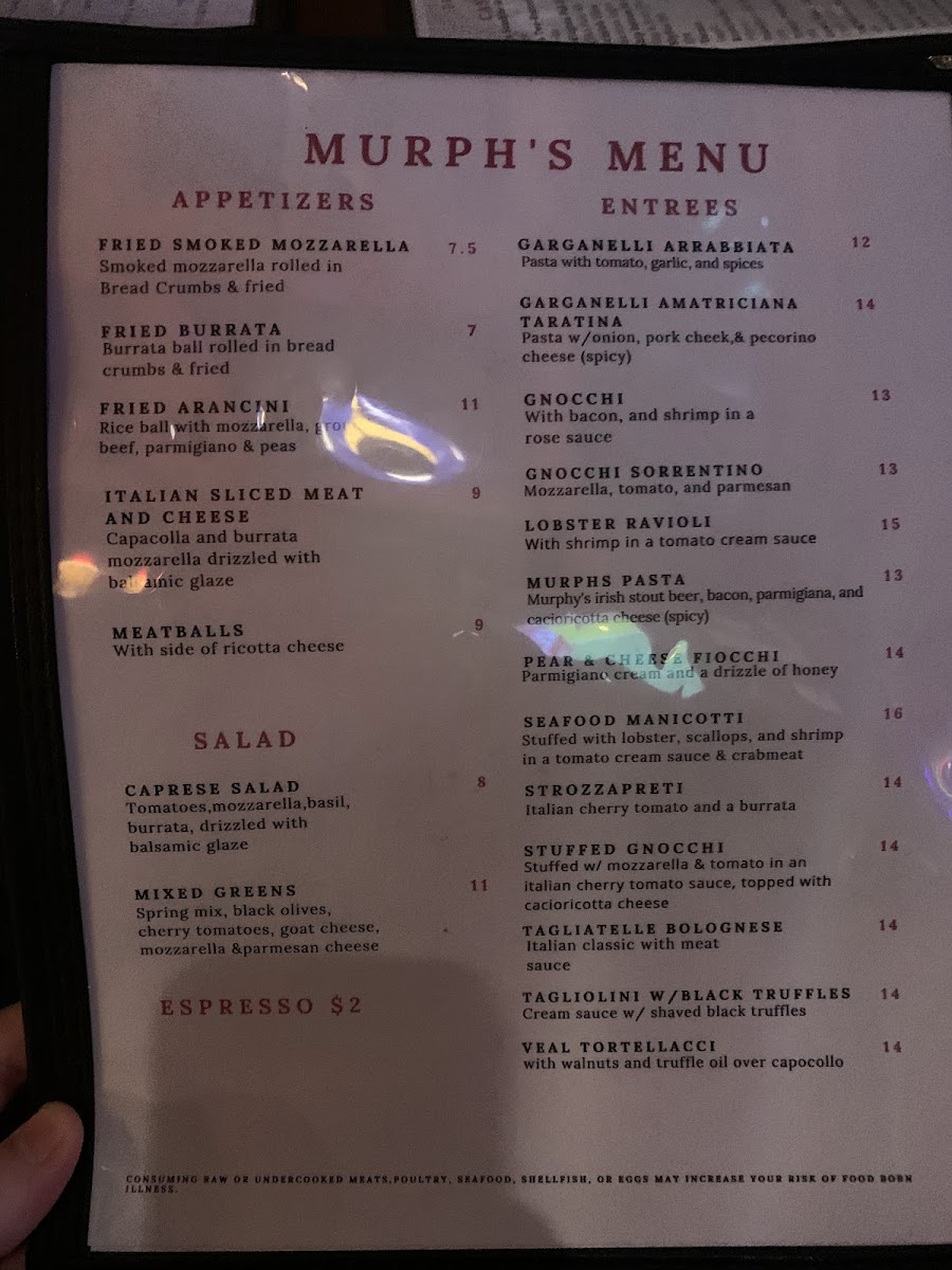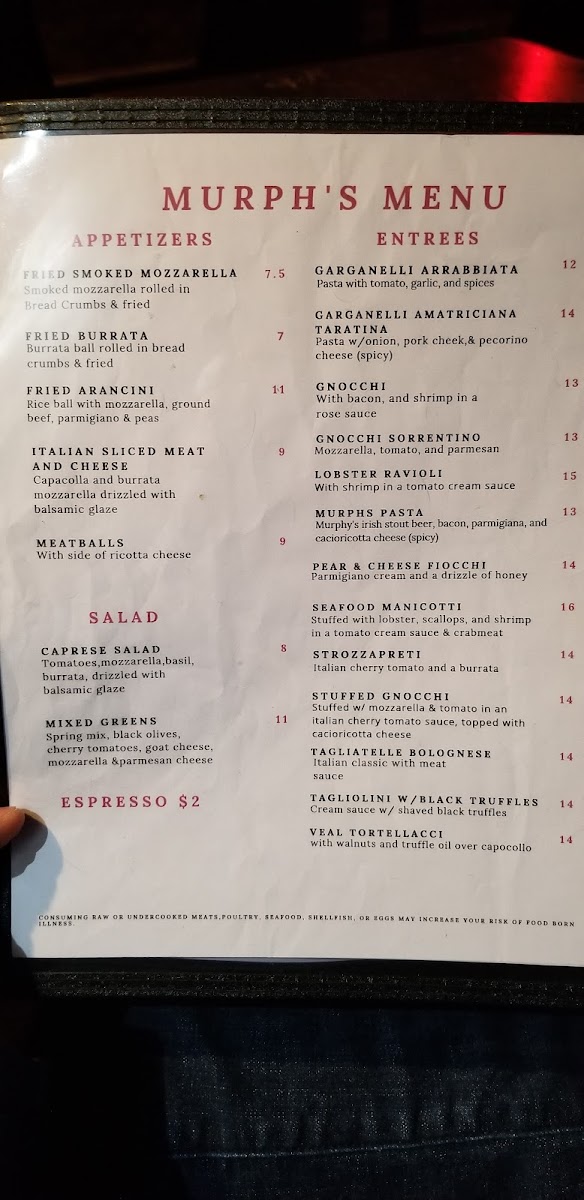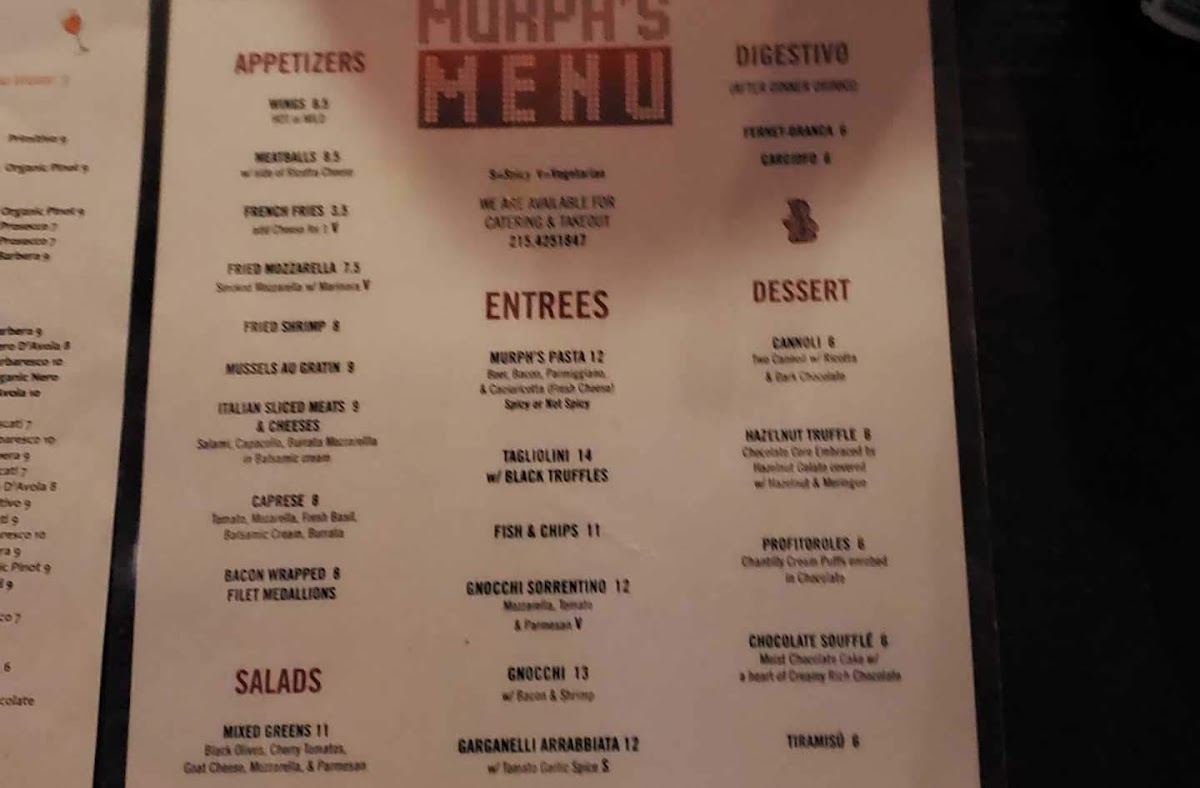 Welcome to Murph's Bar, a charming culinary gem nestled in the heart of Philadelphia. Renowned for its delightful Italian fare, the menu features an enticing selection that ranges from savory appetizers to delectable desserts. Start your meal with the Fried Burrata or Involtini Di Melanzane to set the stage for a memorable dining experience.